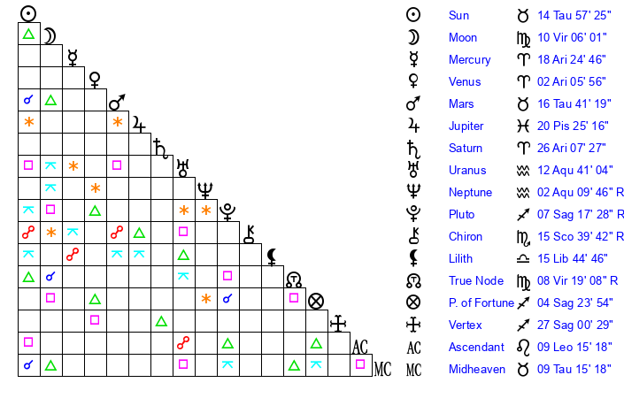| Sun | 14 Taurus 57 | 15 Taurus 24 | 10 Gemini 57 |