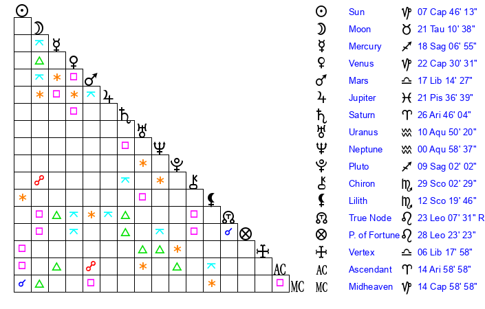 | Sun | 7 Capricorn 46 | 8 Capricorn 29 | 4 Aquarius 16 |