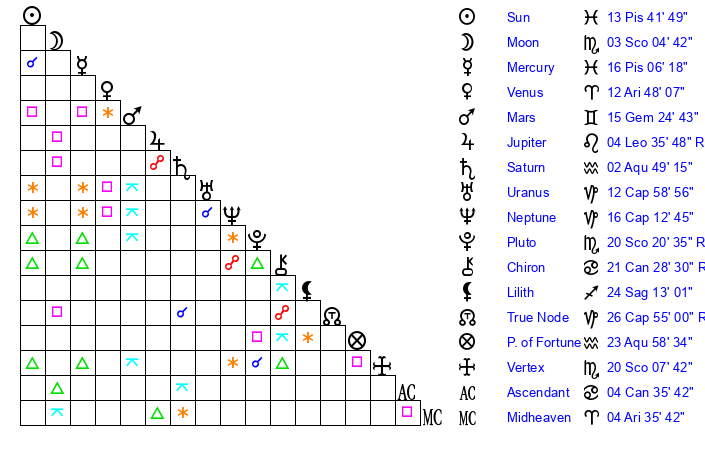 | Pluto | 20 Scorpio 20 | 2 Aquarius 59 | 19 Scorpio 49 |
