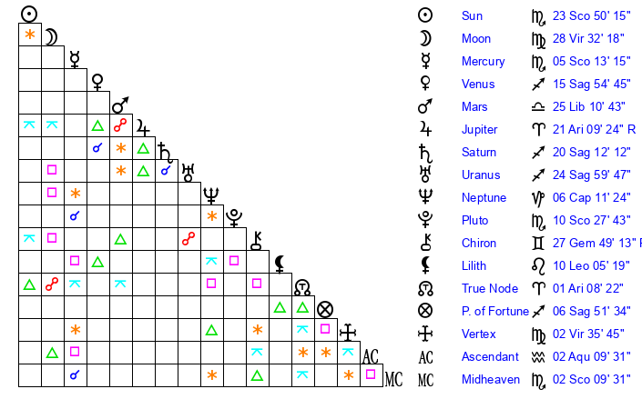 | Moon | 28 Virgo 32 | 16 Libra 8 | 27 Aquarius 14 |