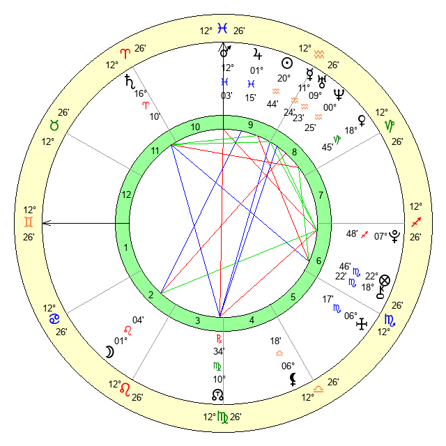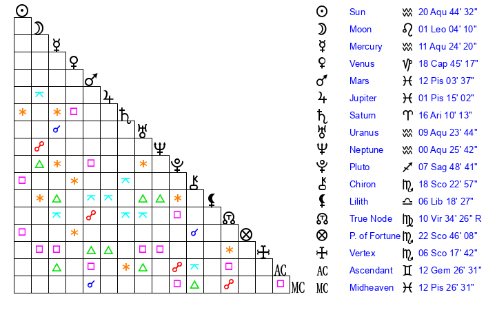 | Neptune | 0 Aquarius 25 | 28 Pisces 13 | 1 Aquarius 18 |