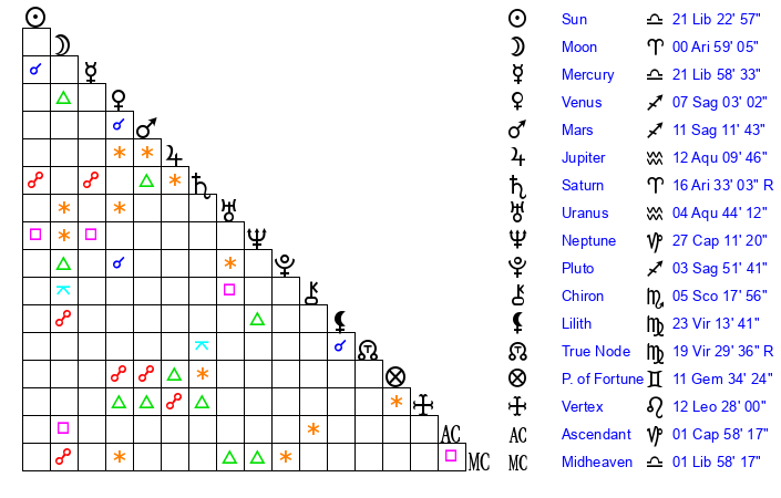 | Saturn | 16 Aries 19 | 26 Pisces 40 | 14 Aries 21 |