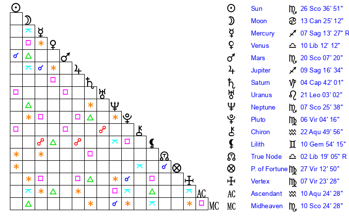 | Venus | 10 Libra 12 | 16 Scorpio 0 | 26 Sagittarius 58 |