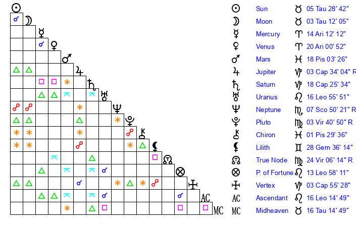 | Sun | 5 Taurus 28 | 5 Taurus 44 | 7 Cancer 55 |