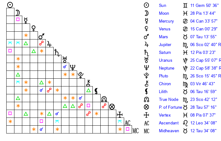 Moon | 28 Pisces 16 | 6 Virgo 24 | 12 Taurus 5 |