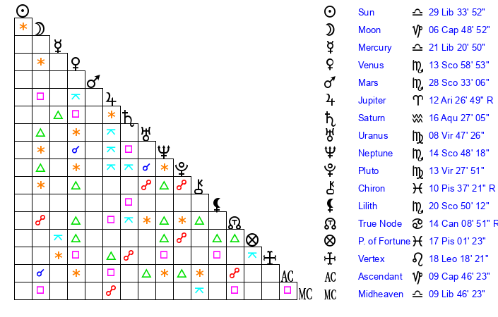 | Moon | 6 Capricorn 51 | 24 Scorpio 27 | 13 Aries 32 |