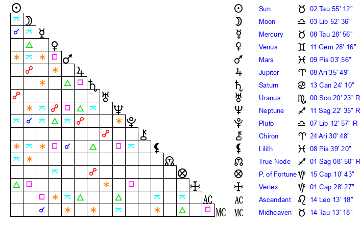 | Neptune | 11 Sagittarius 21 | 0 Aries 51 | 10 Sagittarius 6 |