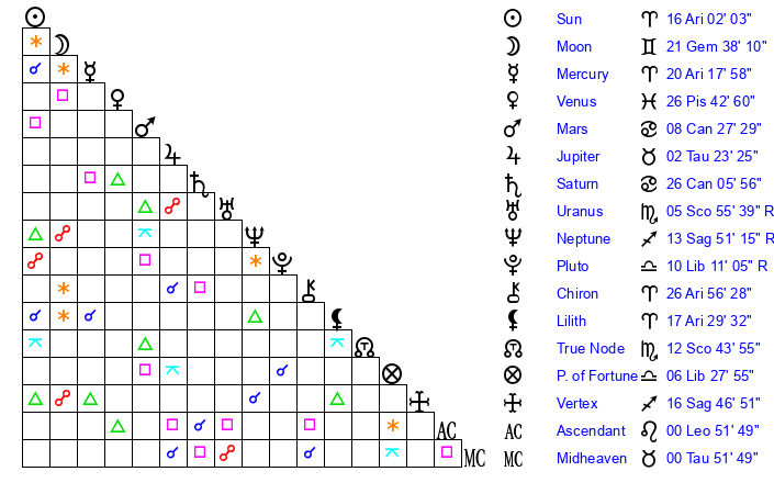 | Sun | 16 Aries 2 | 16 Aries 9 | 3 Gemini 38 |