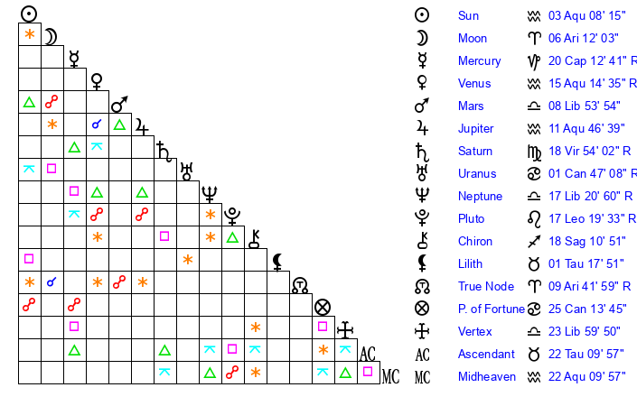 | Sun | 3 Aquarius 8 | 3 Aquarius 57 | 18 Aries 17 |