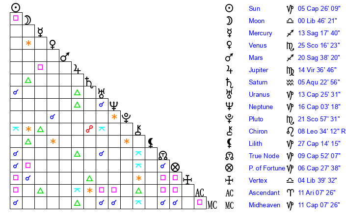 | Sun | 5 Capricorn 26 | 6 Capricorn 26 | 9 Aquarius 2 |