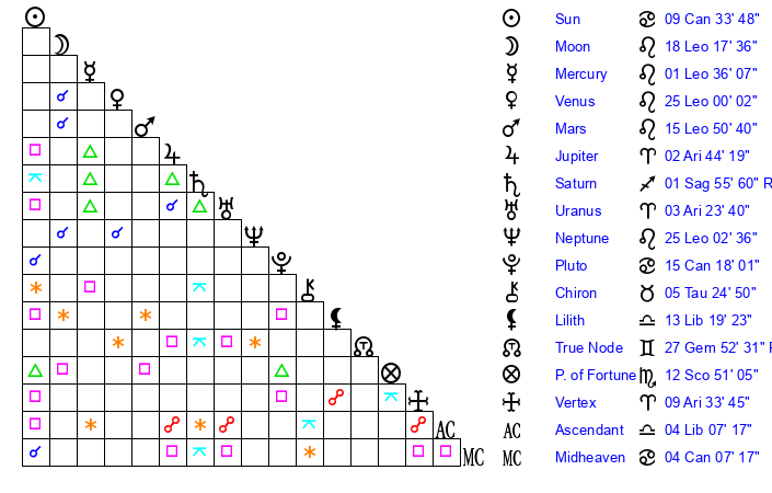 Moon | 18 Leo 19 | 7 Libra 0 | 9 Pisces 50 |