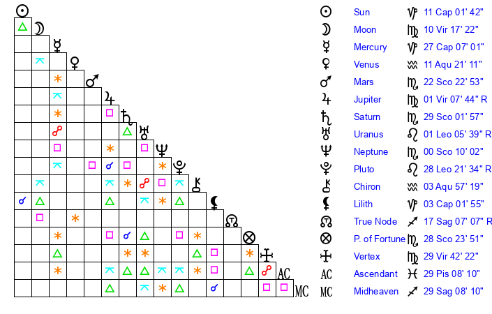 Moon | 10 Virgo 11 | 13 Aquarius 40 | 7 Pisces 45 |