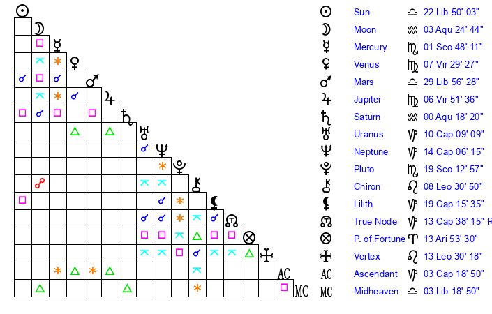 | Moon | 3 Aquarius 27 | 29 Leo 20 | 27 Aries 9 |