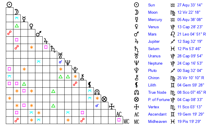 | Sun | 27 Aquarius 33 | 28 Aquarius 16 | 27 Pisces 37 |