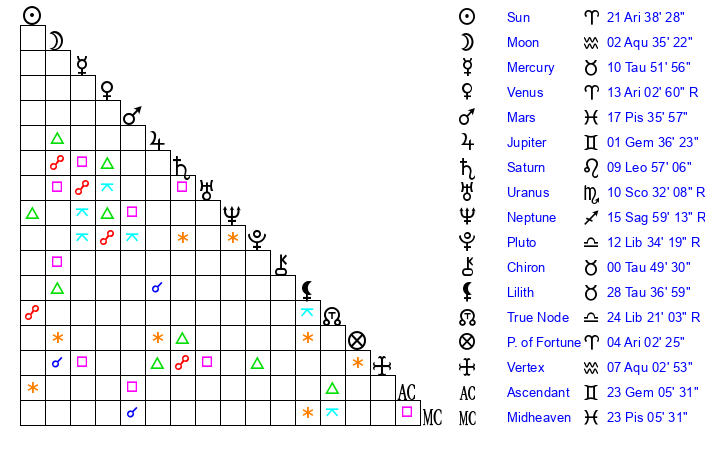 | Sun | 21 Aries 39 | 22 Aries 1 | 8 Gemini 9 |