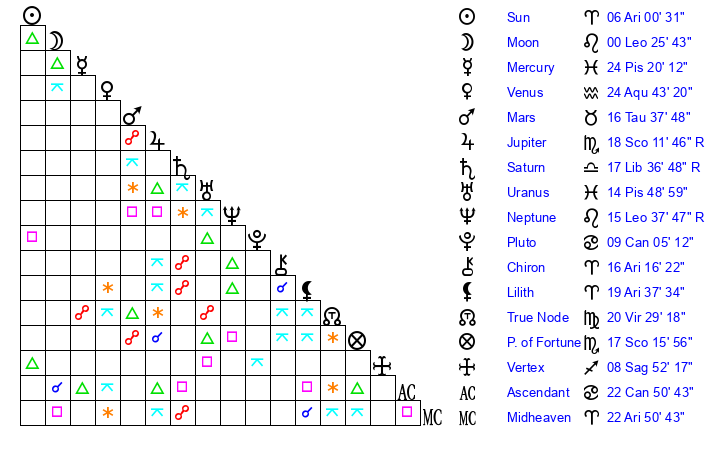 | Sun | 6 Aries 0 | 7 Aries 16 | 14 Cancer 32 |