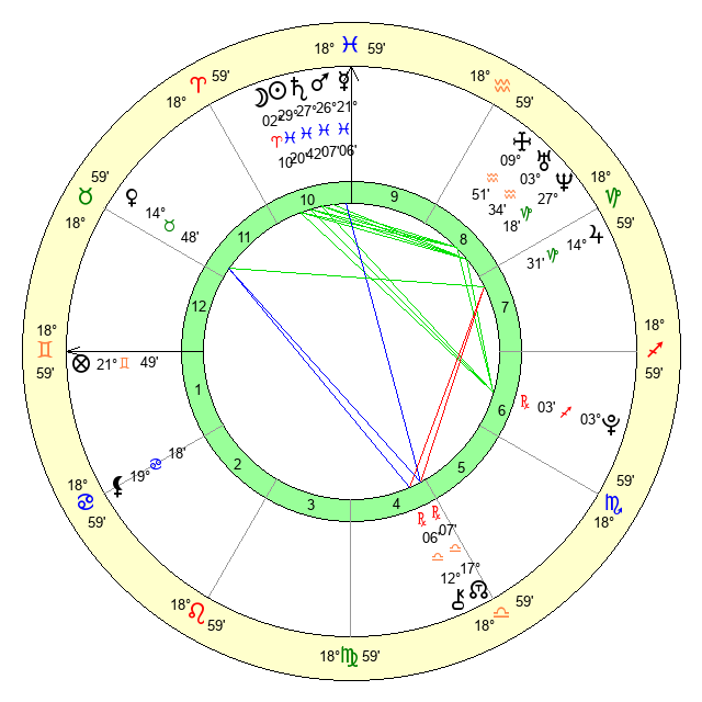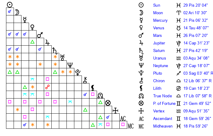 | Sun | 29 Pisces 20 | 29 Pisces 18 | 27 Aries 55 |