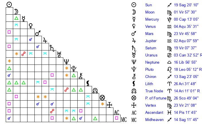 | Saturn | 19 Virgo 37 | 25 Pisces 13 | 17 Virgo 22 |