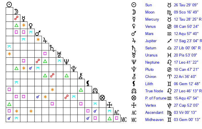 | Sun | 26 Taurus 29 | 27 Taurus 2 | 3 Virgo 9 |