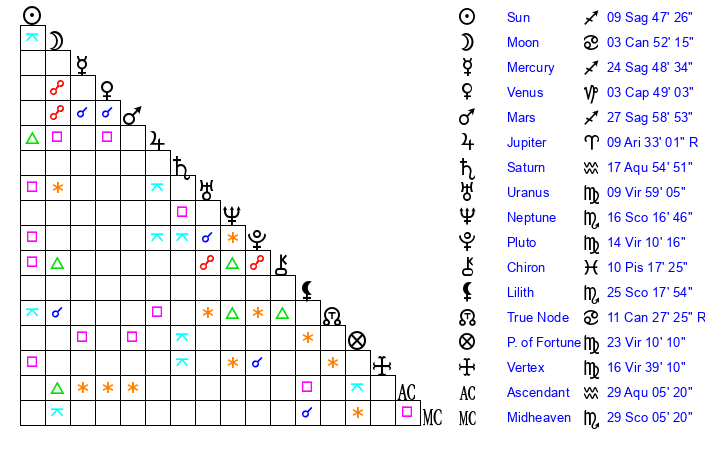| Sun | 9 Sagittarius 48 | 10 Sagittarius 46 | 12 Aquarius 53 |
