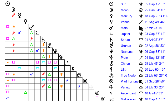 | Mercury | 18 Capricorn 25 | 13 Sagittarius 31 | 9 Capricorn 14 |