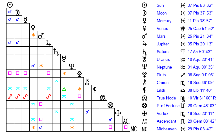 | Sun | 7 Pisces 54 | 8 Pisces 21 | 4 Aries 50 |