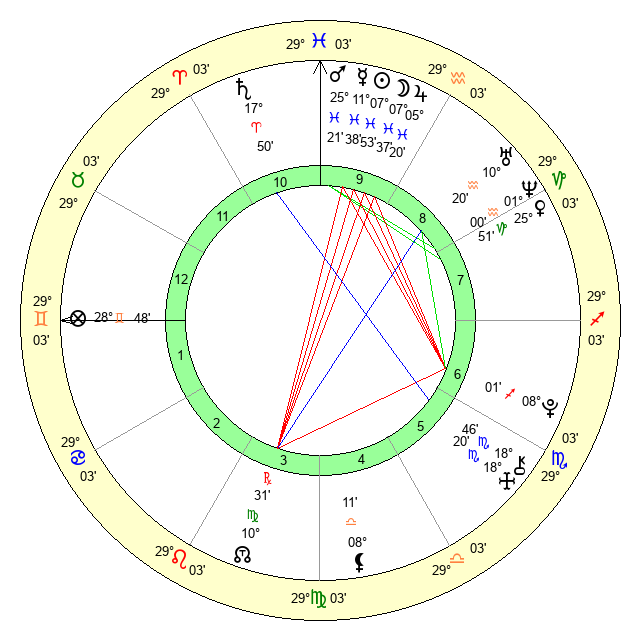 | Moon | 7 Pisces 36 | 20 Aquarius 31 | 0 Pisces 52 |