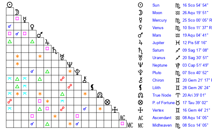 | Sun | 16 Scorpio 55 | 17 Scorpio 42 | 25 Sagittarius 23 |