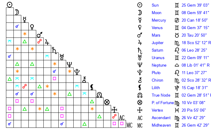 | Sun | 25 Gemini 39 | 26 Gemini 45 | 10 Virgo 21 |