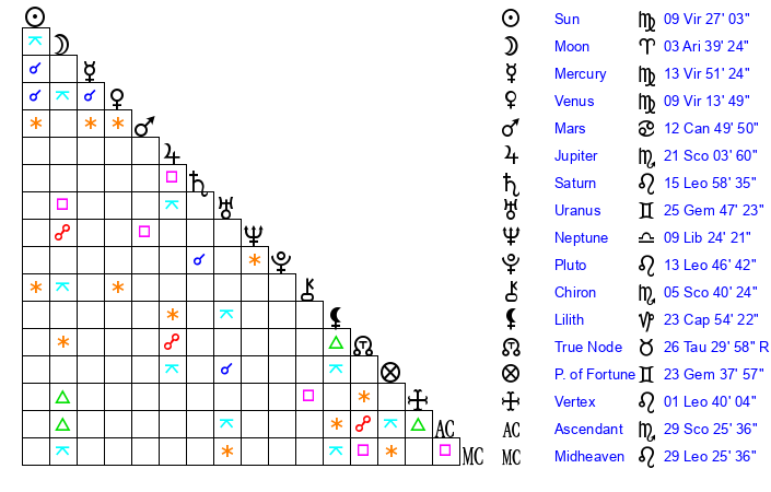 | Mercury | 13 Virgo 52 | 0 Virgo 27 | 7 Scorpio 21 |