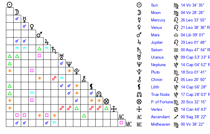 | Moon | 4 Virgo 27 | 14 Pisces 39 | 3 Sagittarius 44 |