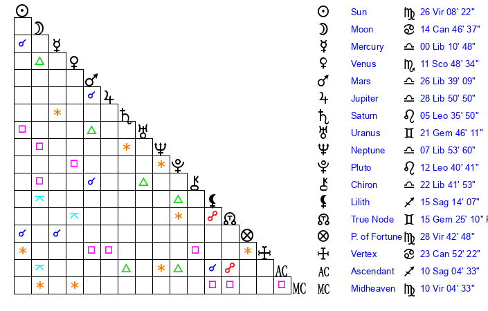 | Sun | 26 Virgo 9 | 27 Virgo 0 | 15 Sagittarius 0 |