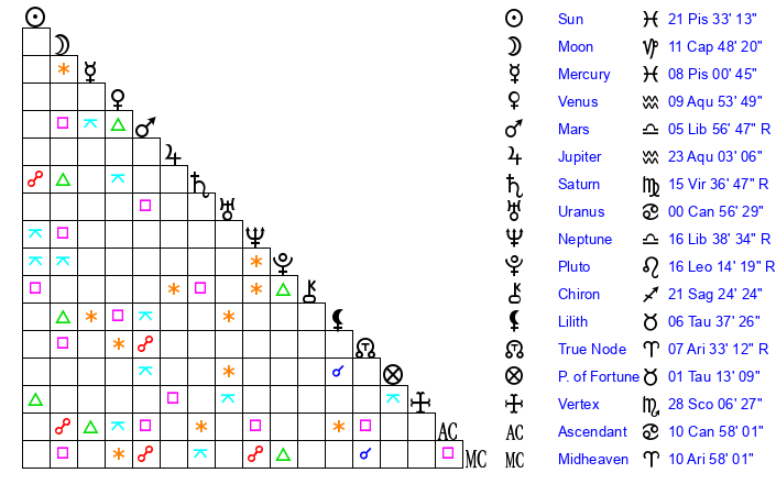 | Saturn | 16 Virgo 10 | 22 Pisces 3 | 13 Virgo 13 |