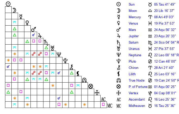 | Sun | 5 Taurus 42 | 6 Taurus 43 | 10 Leo 35 |