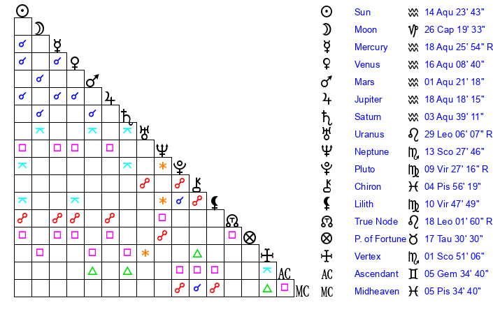 | Saturn | 3 Aquarius 55 | 17 Pisces 39 | 10 Aquarius 7 |