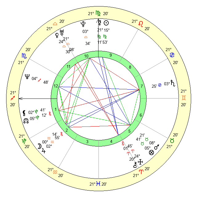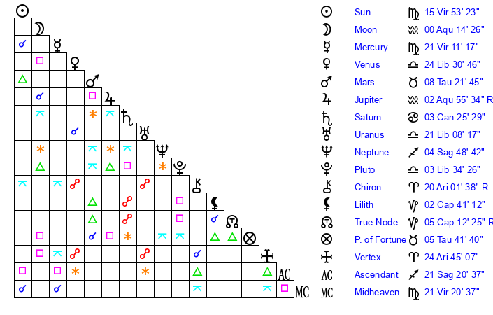 | Mercury | 21 Virgo 11 | 11 Virgo 53 | 26 Scorpio 35 |
