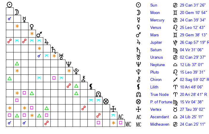 | Moon | 20 Gemini 6 | 2 Cancer 37 | 8 Aries 38 |
