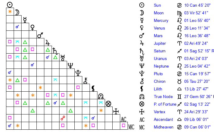 | Neptune | 25 Leo 5 | 2 Aries 10 | 28 Leo 25 |