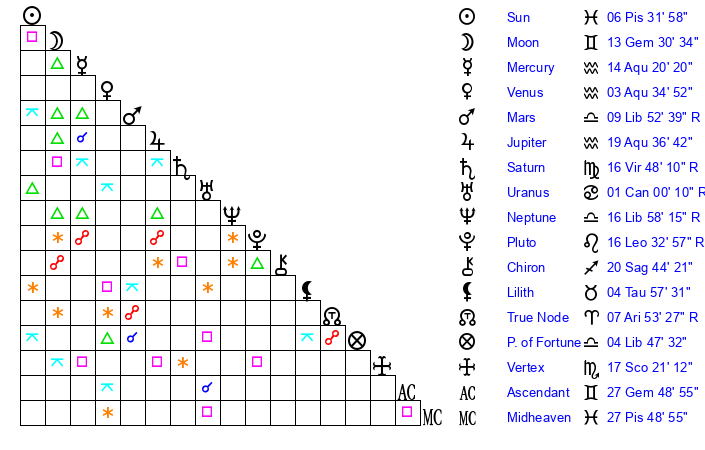 | Neptune | 16 Libra 57 | 28 Pisces 46 | 15 Libra 5 |