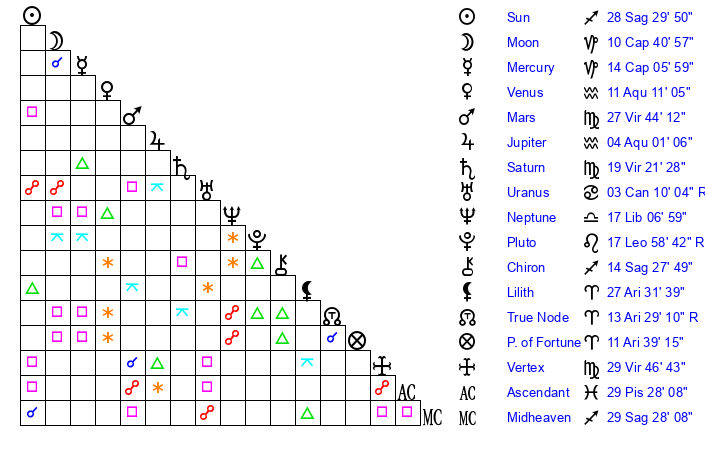 | Venus | 11 Aquarius 11 | 25 Sagittarius 0 | 6 Aquarius 37 |