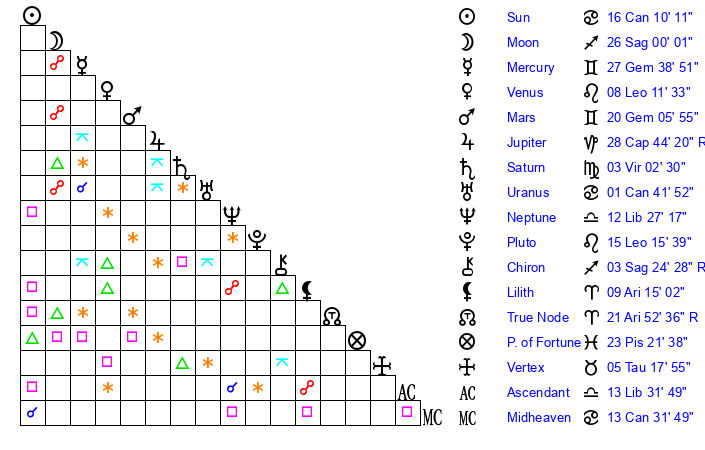 | Moon | 25 Sagittarius 55 | 21 Sagittarius 46 | 1 Libra 57 |