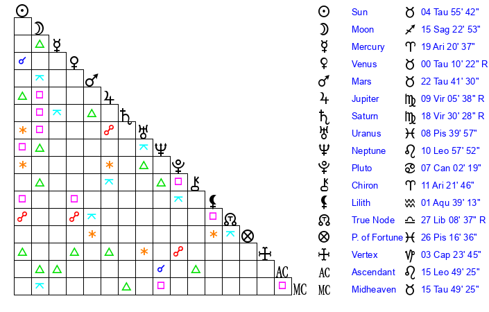 | Sun | 4 Taurus 56 | 5 Taurus 44 | 14 Leo 36 |