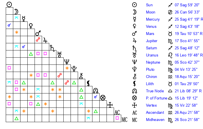 | Saturn | 26 Sagittarius 9 | 25 Pisces 4 | 3 Capricorn 42 |