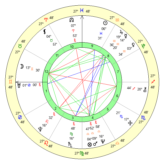 | Moon | 13 Gemini 21 | 6 Aquarius 26 | 22 Pisces 16 |
