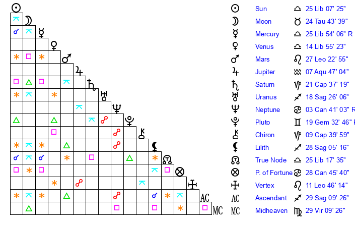 | Sun | 25 Libra 7 | 26 Libra 19 | 29 Aquarius 38 |