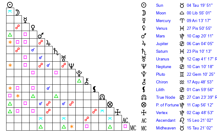 | Moon | 0 Libra 53 | 6 Aries 0 | 2 Aquarius 31 |