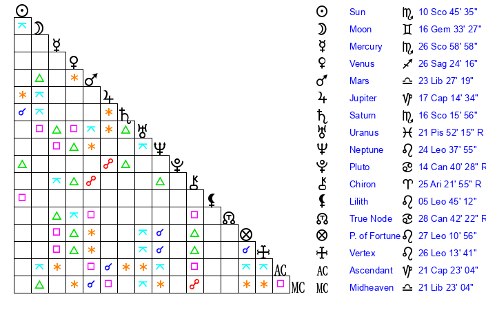 | Saturn | 16 Scorpio 44 | 25 Pisces 34 | 26 Scorpio 7 |