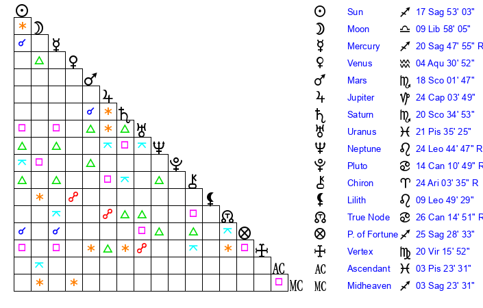 | Sun | 17 Sagittarius 53 | 18 Sagittarius 38 | 29 Pisces 5 |
