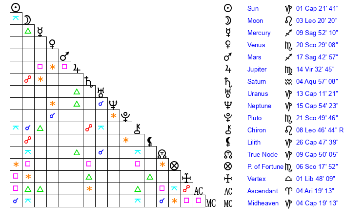 | Sun | 1 Capricorn 21 | 2 Capricorn 22 | 4 Aquarius 58 |