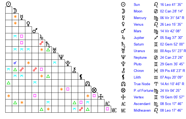| Sun | 16 Leo 42 | 17 Leo 21 | 8 Sagittarius 9 |